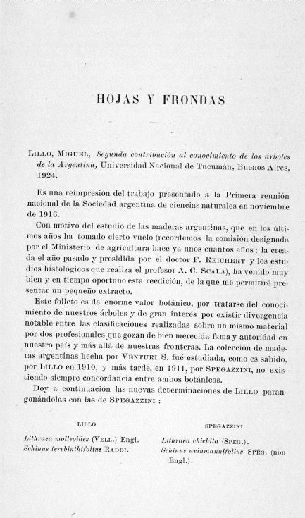 - Lillo, M. (1924). Segunda contribución al conocimiento de los árboles de la Argentina. Universidad Nacional de Tucumán.